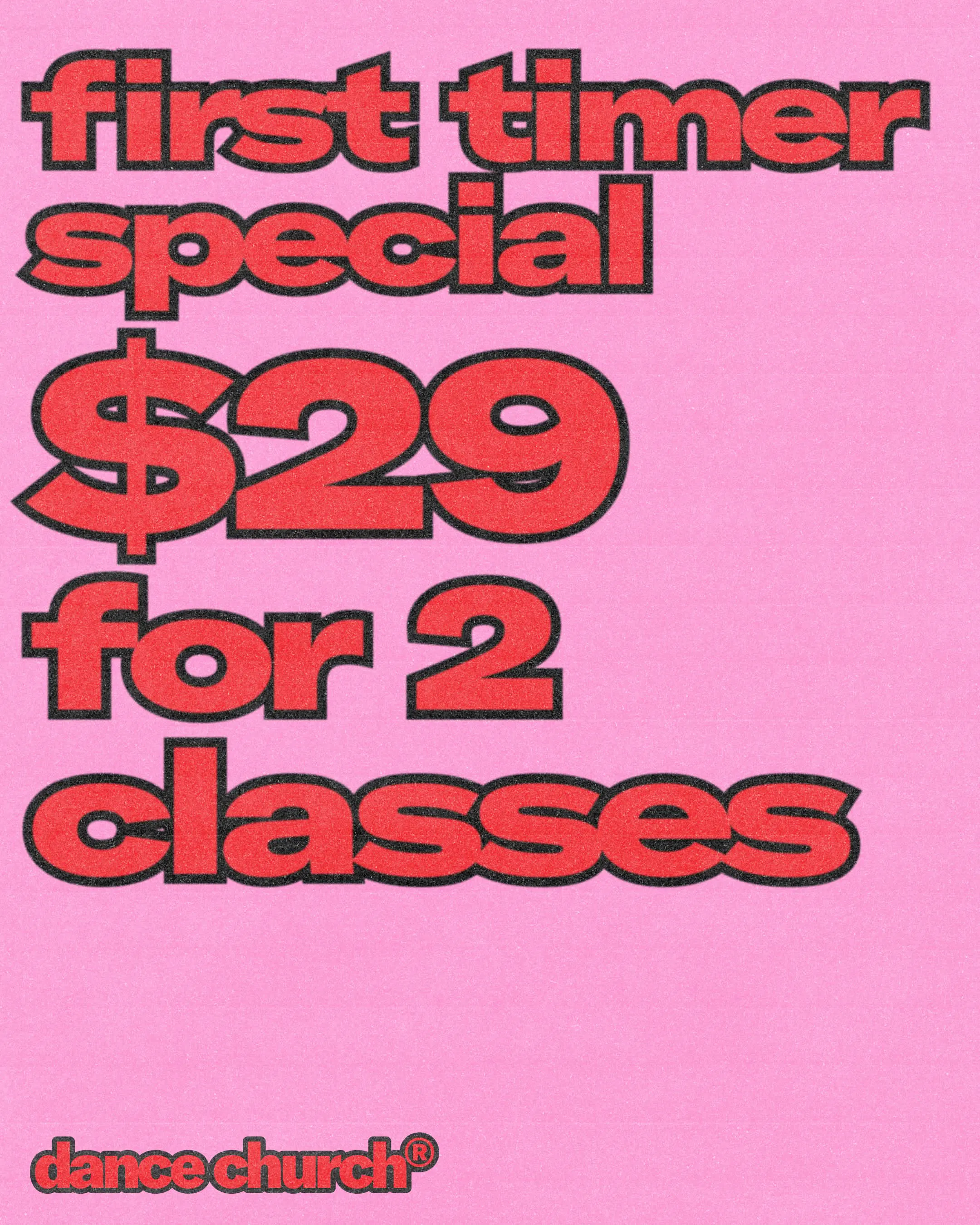 New to Dance Church? 💞 Get 2 in-person classes for $29 (save $17). Your pass is valid for 21 days from purchase and available to first-time Dance Church-ers only.