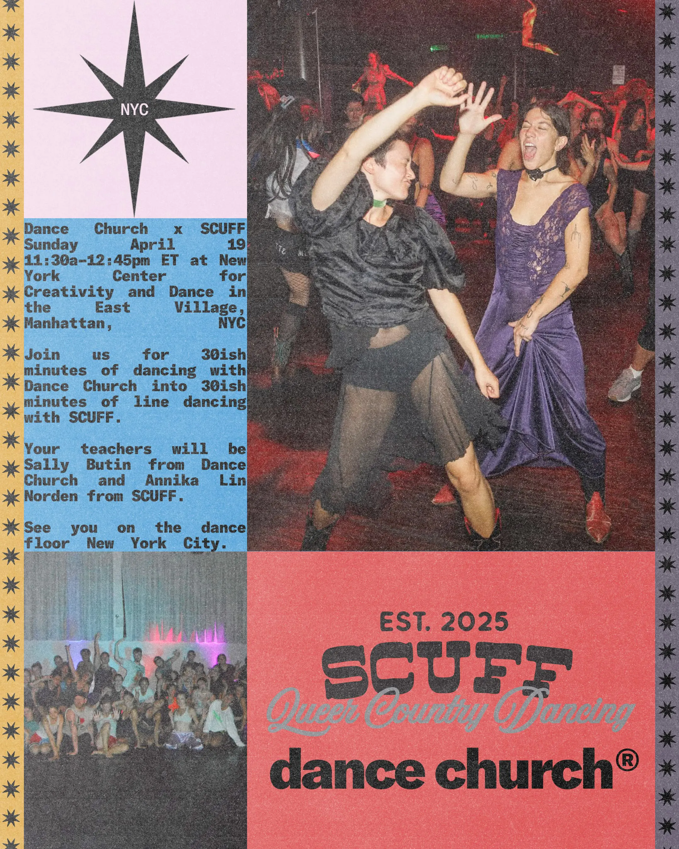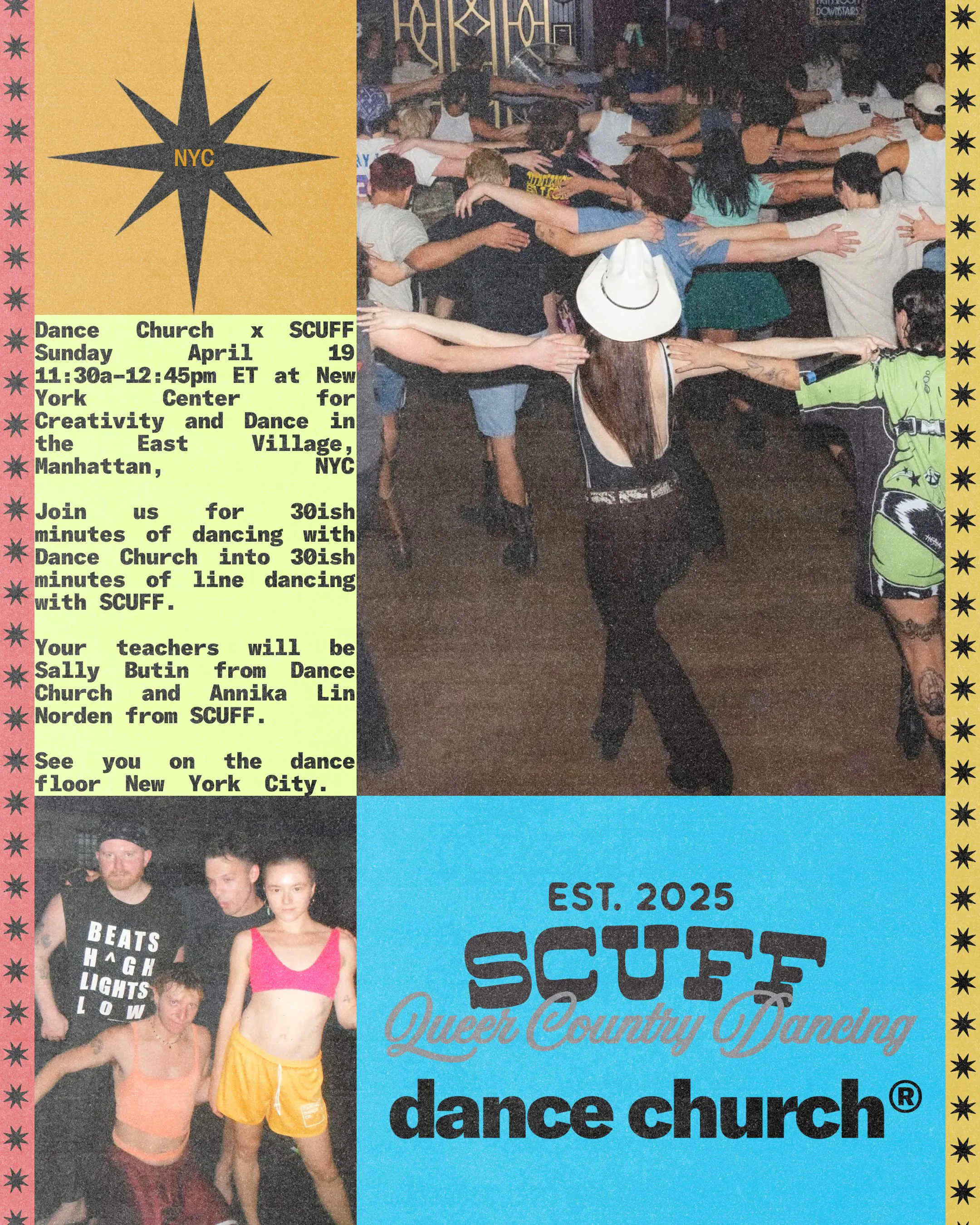 NYC Dance Church & SCUFF are hitting the floor on Sunday morning 4/19 in the East Village. Join us for 30ish minutes of dancing with Dance Church into 30ish minutes of line dancing with SCUFF.